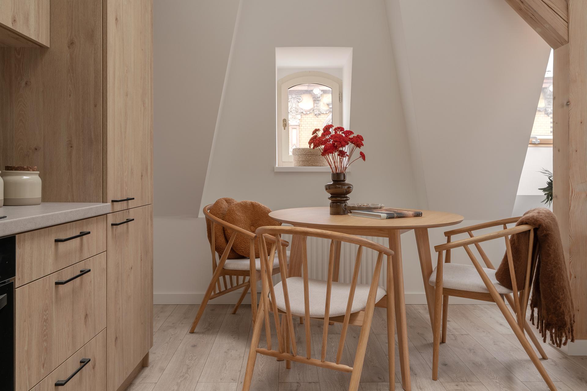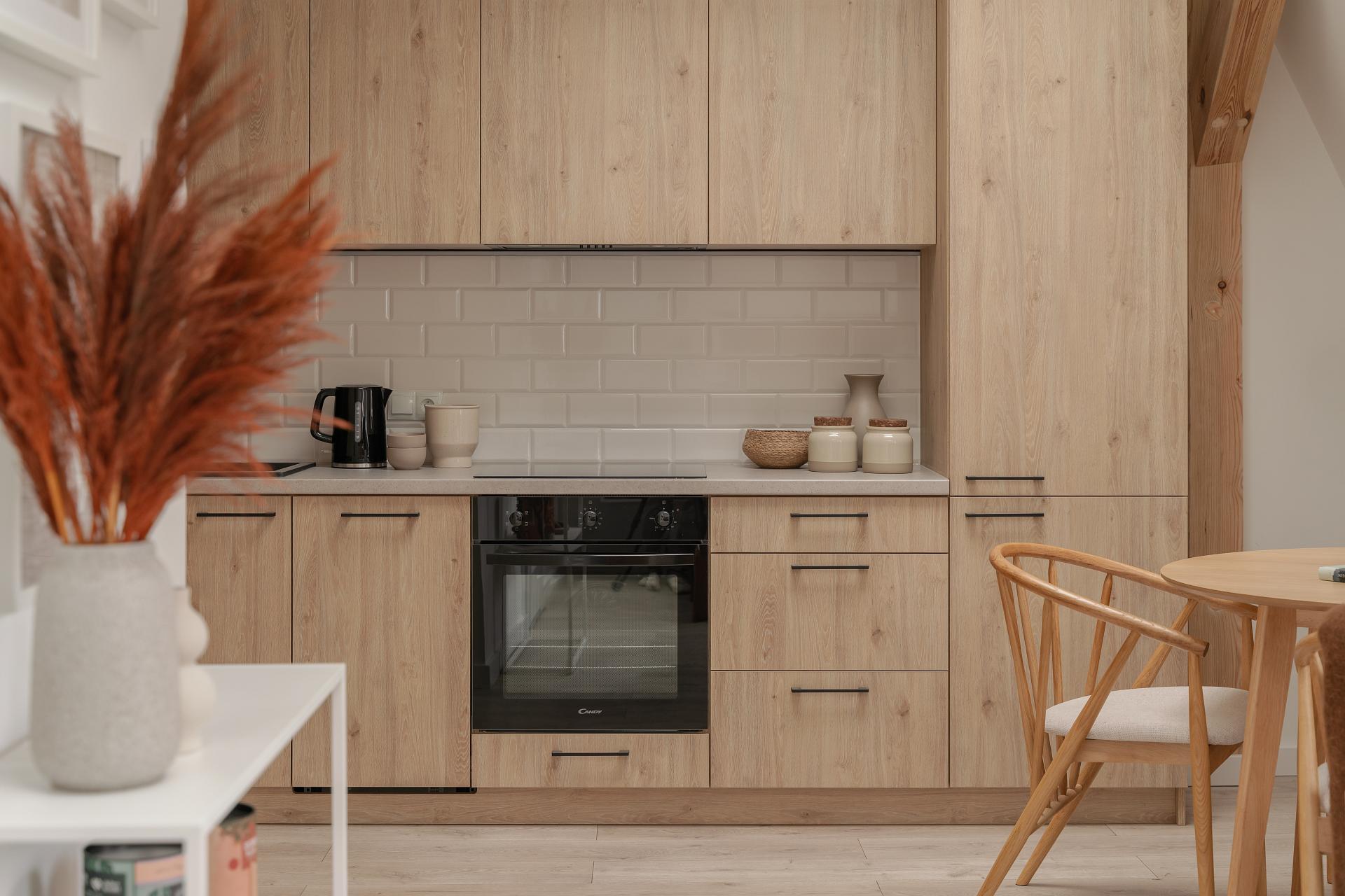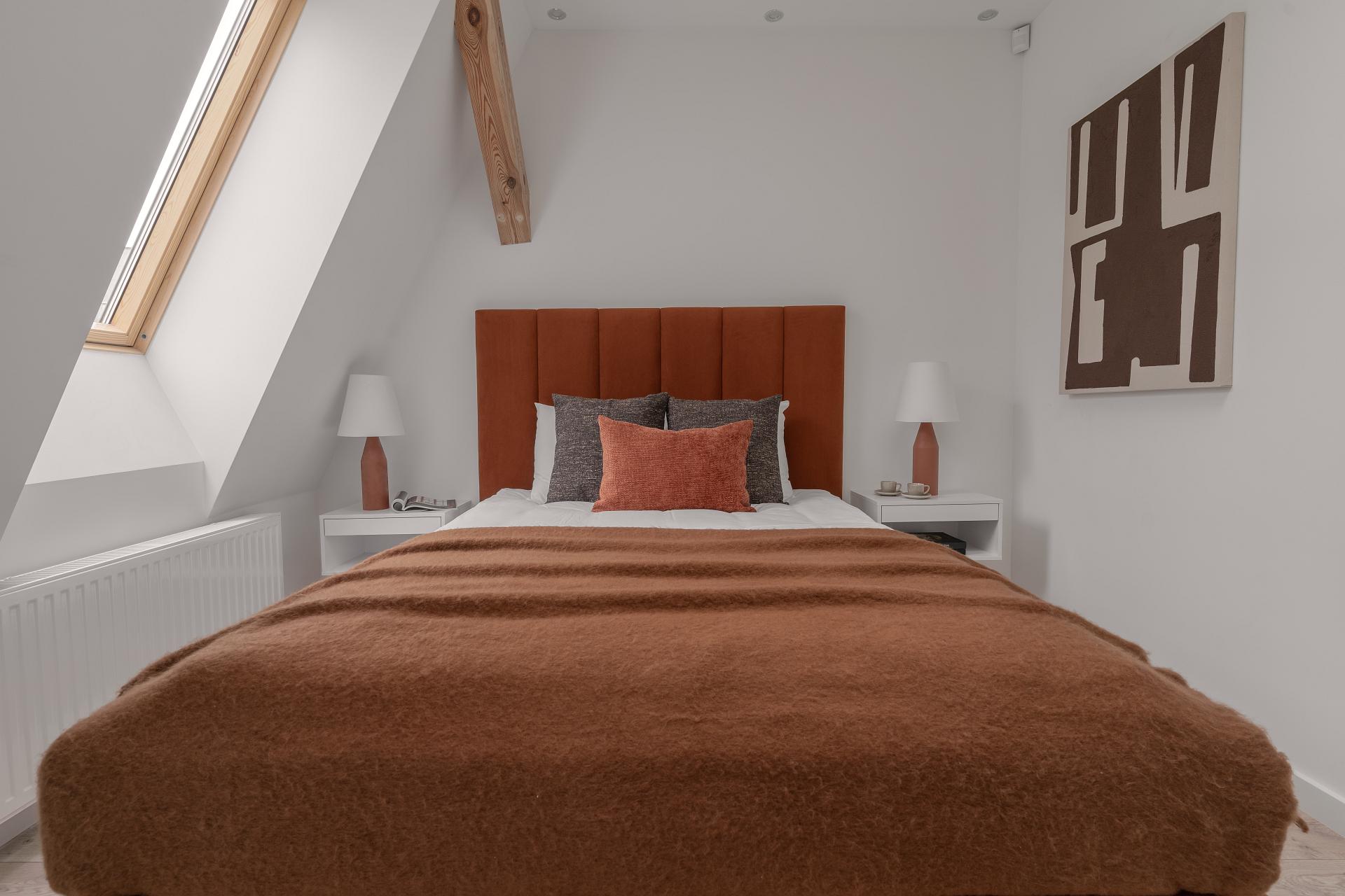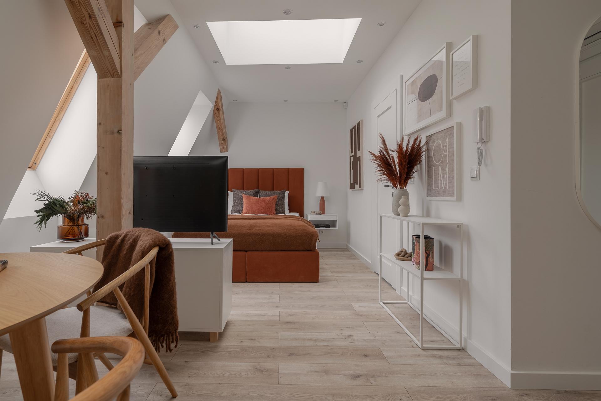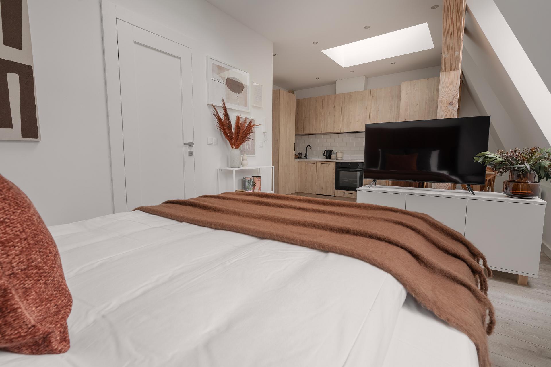 Jasne wnętrze z akcentami w odcieniach beżu i pomarańczy wprowadza spokój połączony jednak z nutą energii. W przestronnym pokoju znajdziesz wygodne łóżko z miękkim zagłówkiem, idealne na relaks po dniu pełnym wrażeń. Obok znajduje się część jadalniana z okrągłym stołem – idealna na poranną kawę lub romantyczną kolację we dwoje. Nowoczesny aneks kuchenny został w pełni wyposażony, abyś mógł poczuć się jak w domu – jest tu ekspres do kawy Nespresso, czajnik, płyta grzewcza i niezbędne naczynia.