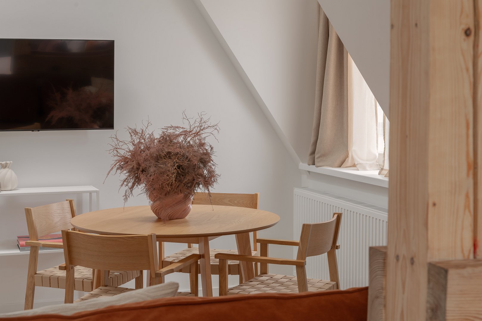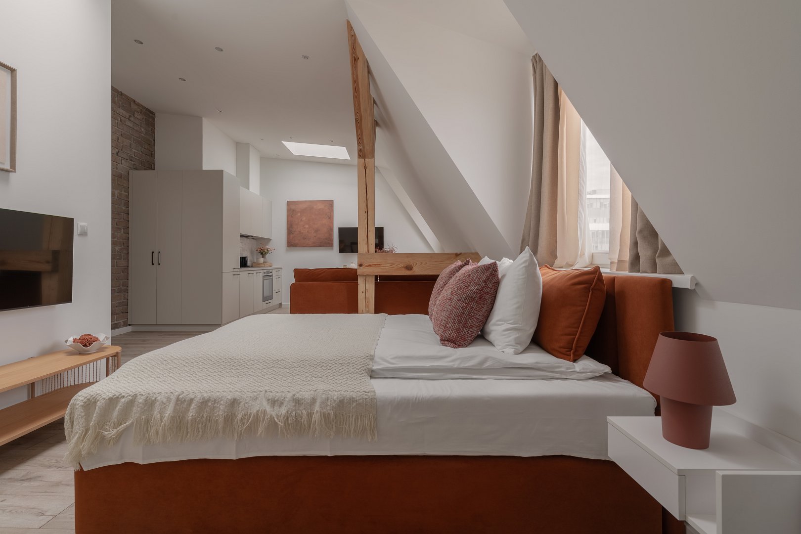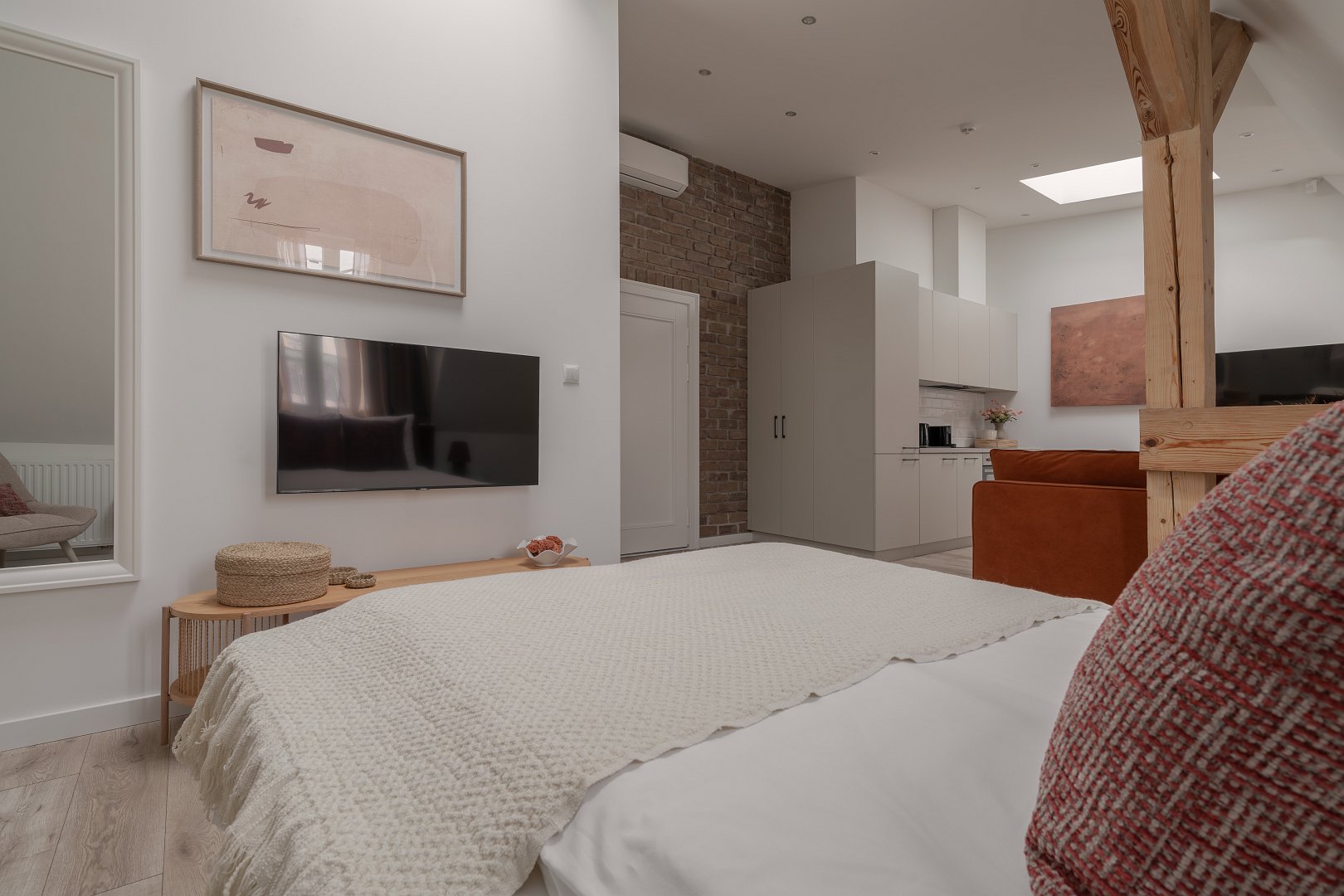 asne wnętrze z akcentami w odcieniach beżu i marchewki wprowadza spokój i harmonię, a ściana z naturalnej cegły dodaje mu charakteru i niepowtarzalnego klimatu. Wyodrębniliśmy część dzienną z rozkładaną kanapą, telewizorem i okrągłym stołem jadalnianym – idealnym na poranną kawę lub romantyczną kolację we dwoje. Nowoczesny aneks kuchenny został w pełni wyposażony, tak aby można było poczuć się jak w domu – jest tu ekspres do kawy Nespresso, czajnik, płyta grzewcza i niezbędne naczynia. Wyodrębniliśmy również część sypialnianą w której znajdziesz wygodne łóżko z miękkim zagłówkiem, idealne na relaks po dniu pełnym wrażeń.