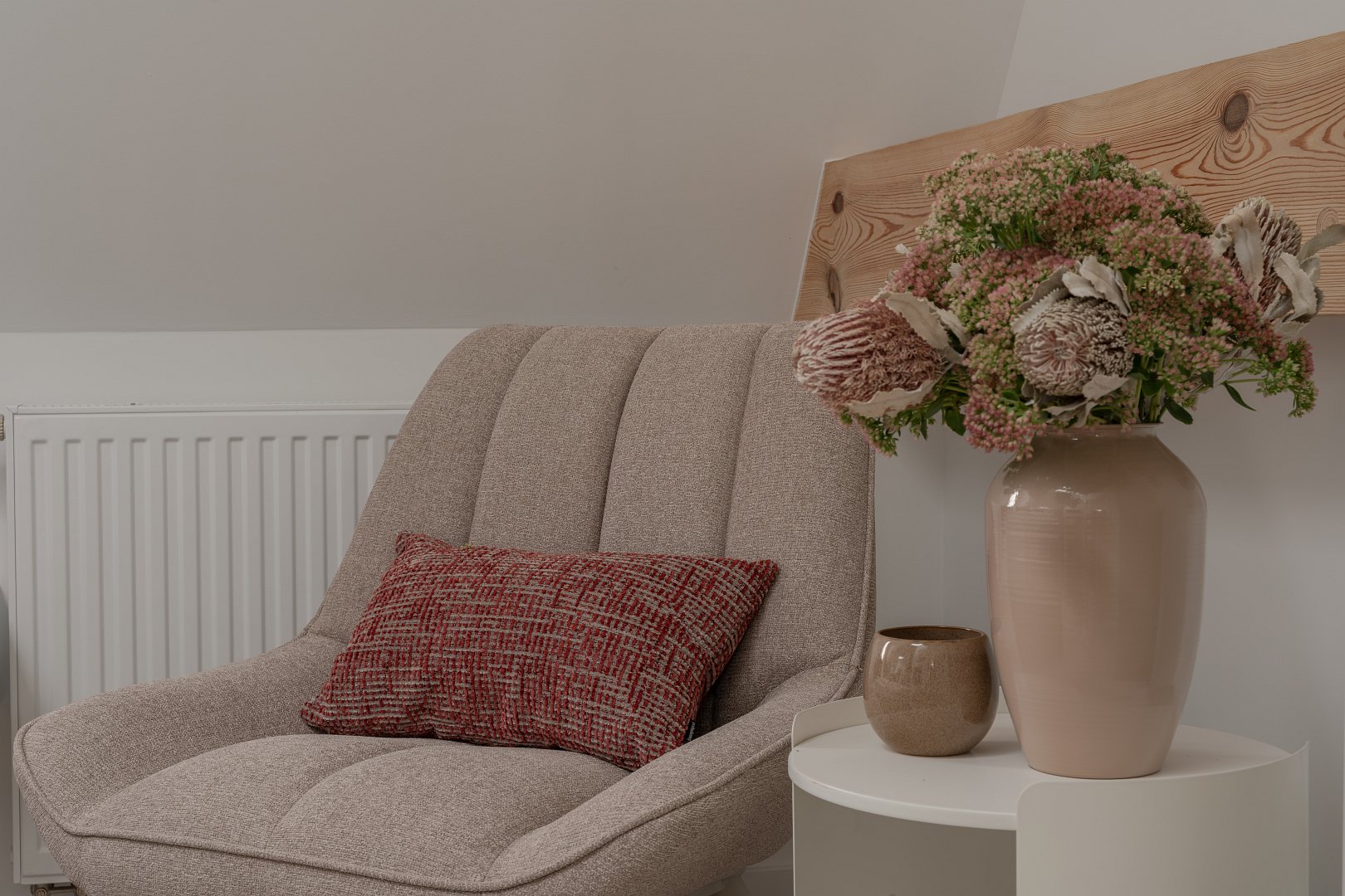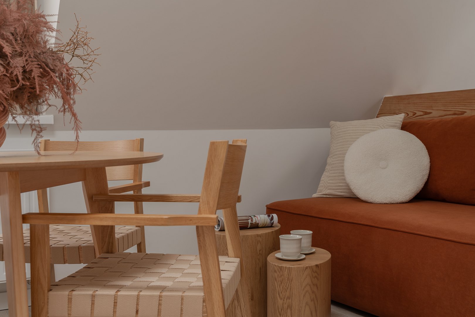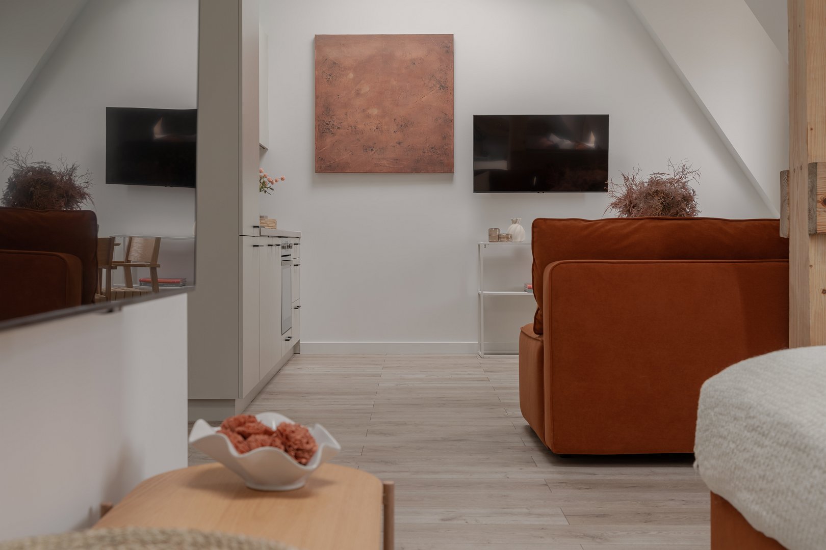 asne wnętrze z akcentami w odcieniach beżu i marchewki wprowadza spokój i harmonię, a ściana z naturalnej cegły dodaje mu charakteru i niepowtarzalnego klimatu. Wyodrębniliśmy część dzienną z rozkładaną kanapą, telewizorem i okrągłym stołem jadalnianym – idealnym na poranną kawę lub romantyczną kolację we dwoje. Nowoczesny aneks kuchenny został w pełni wyposażony, tak aby można było poczuć się jak w domu – jest tu ekspres do kawy Nespresso, czajnik, płyta grzewcza i niezbędne naczynia. Wyodrębniliśmy również część sypialnianą w której znajdziesz wygodne łóżko z miękkim zagłówkiem, idealne na relaks po dniu pełnym wrażeń.