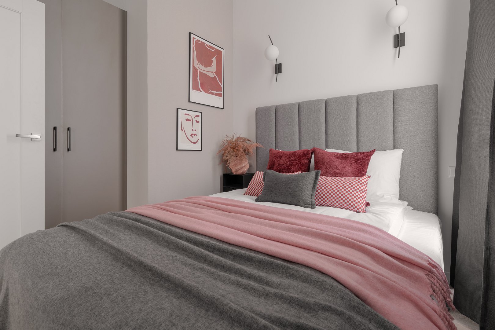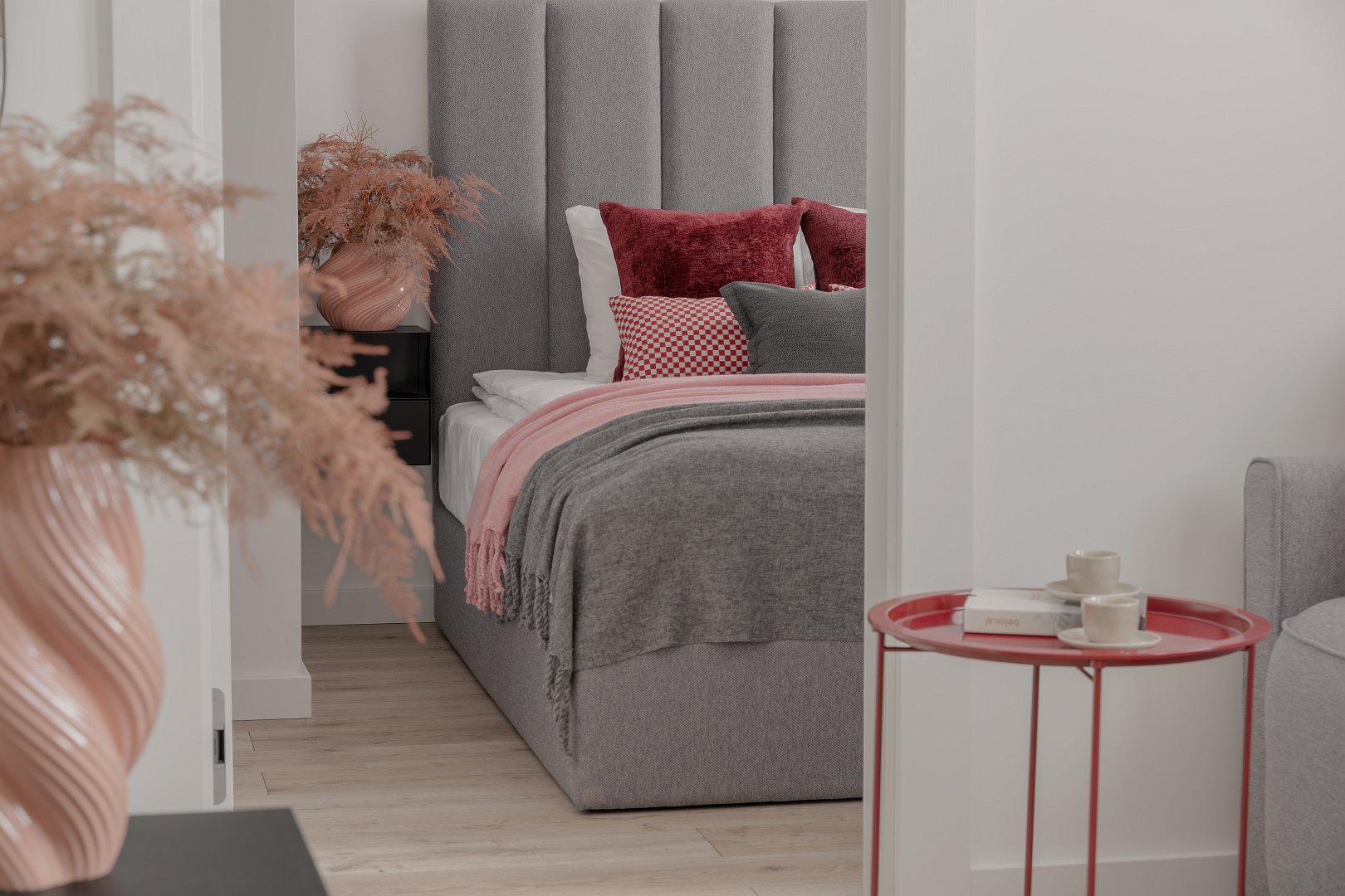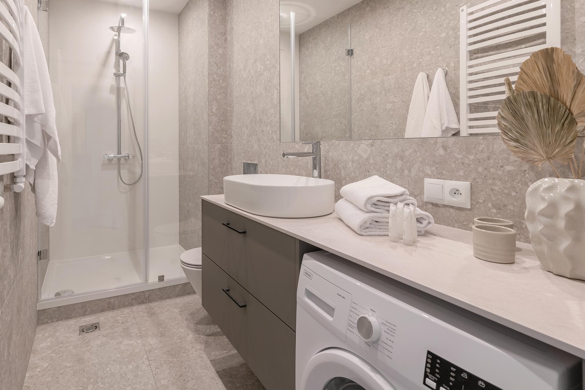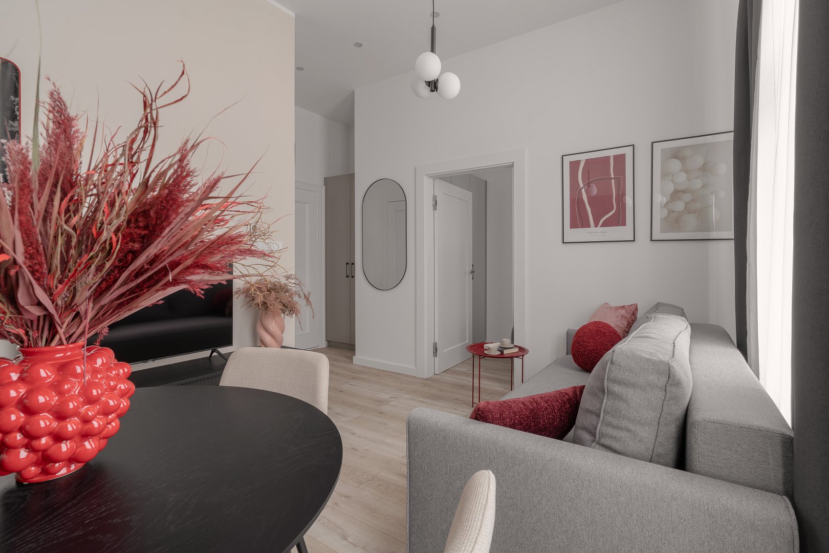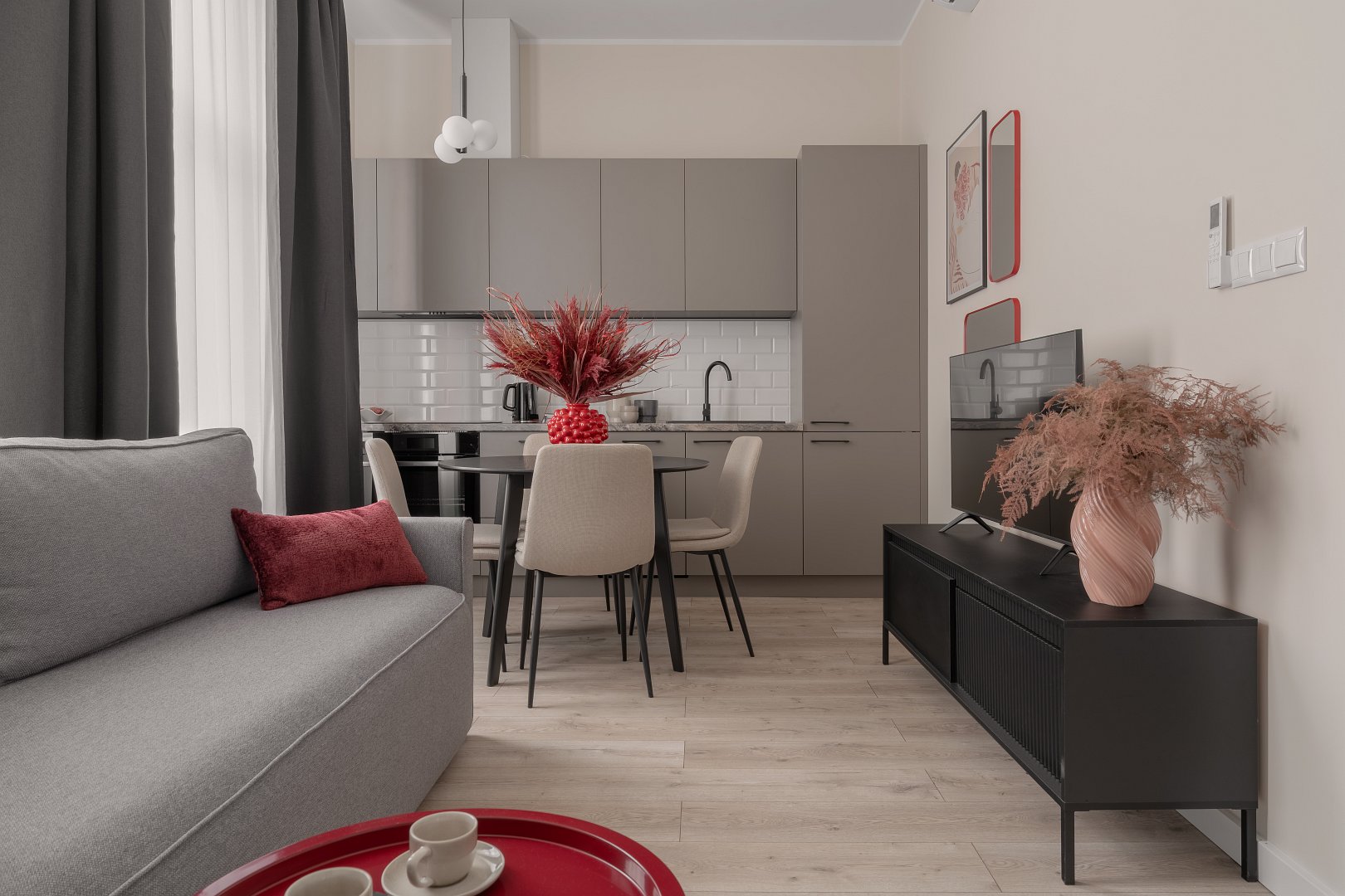 Jasne wnętrze z akcentami w odcieniach beżu i czerwieni wprowadza spokój połączony jednak z nutą energii. W przestronnej części dziennej znajdziesz rozkładaną kanapę  oraz jadalnię z okrągłym stołem – idealna na poranną kawę lub romantyczną kolację we dwoje. Nowoczesny aneks kuchenny został w pełni wyposażony, aby można było poczuć się tutaj jak w domu – jest tu ekspres do kawy Nespresso, czajnik, płyta grzewcza i niezbędne naczynia. W osobnej sypialni czeka na Ciebie wygodne łóżko z miękkim zagłówkiem, idealne na relaks po dniu pełnym wrażeń.